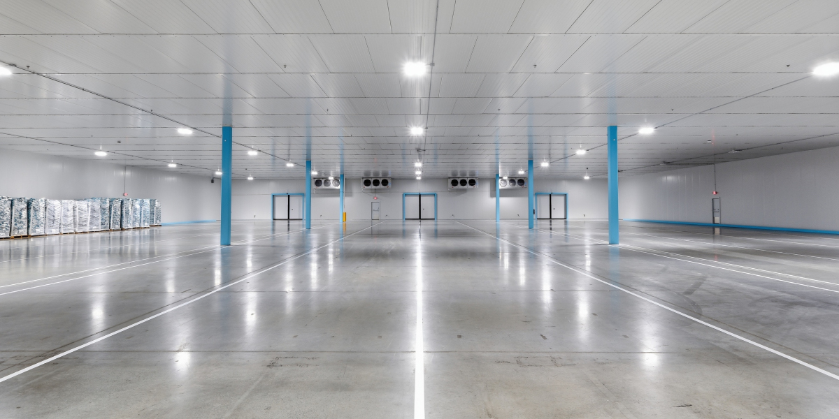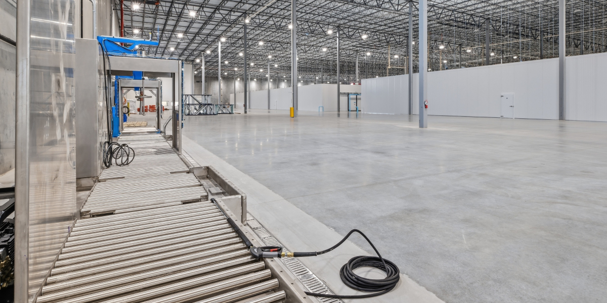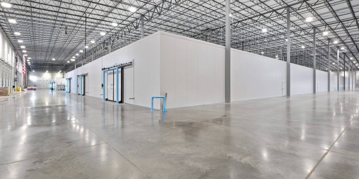The scope of work included the construction of four 30,000-square-foot 40°F cooler rooms within the existing warehouse footprint. The facility features a 40-foot clear height and incorporates insulated metal panels to create high-performance thermal enclosures.