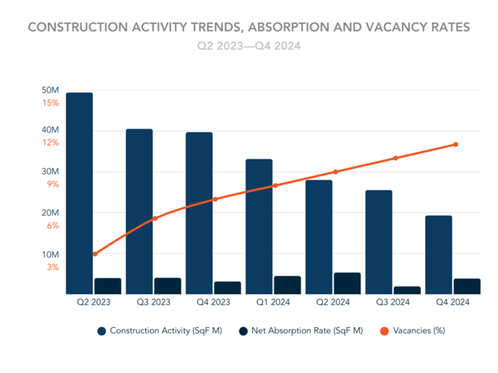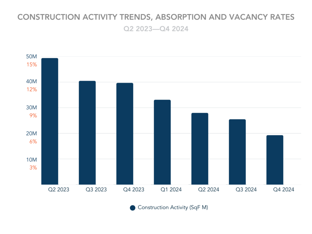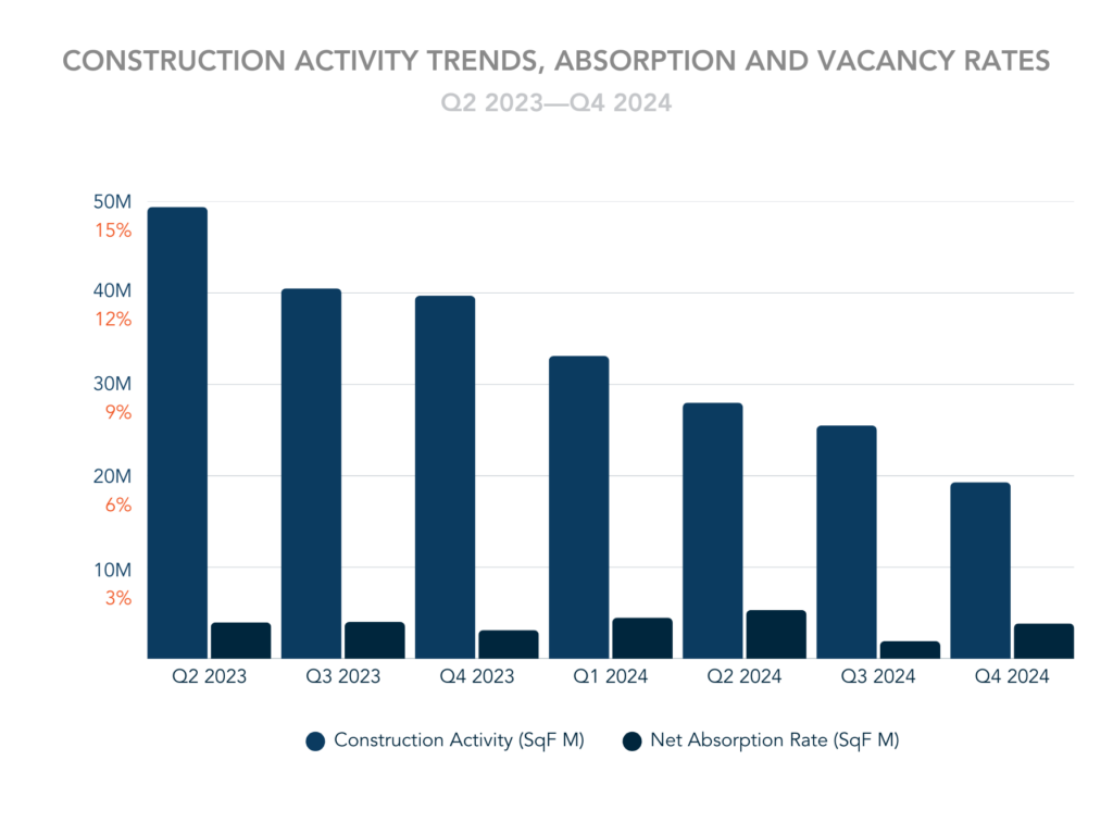 - Construction activity reduced significantly from 49.3M SF in Q2 2023 to 19.3M SF in Q4 2024, indicating a cautious approach by developers amid rising vacancies.